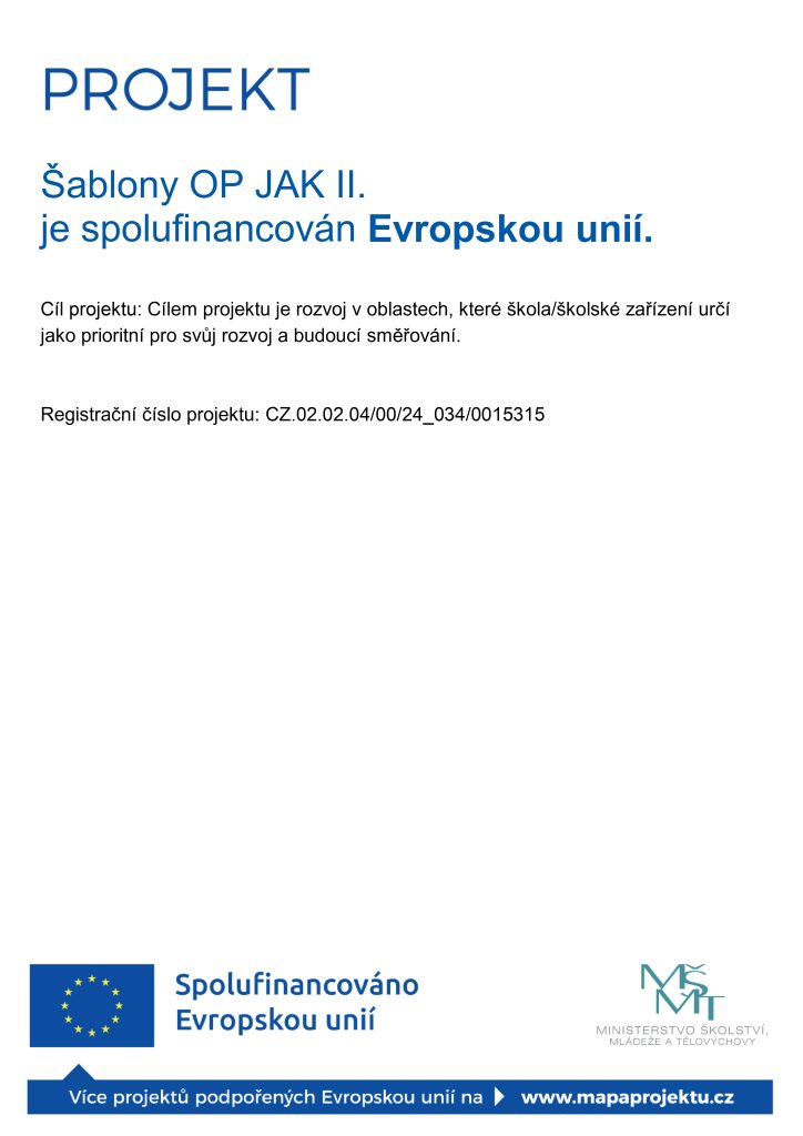 V rámci projektu Šablony OP JAK II. se zaměřujeme na další vzdělávánípedagogických pracovníků, a to zejména v oblasti inovativních metod aforem výuky, využívání digitálních technologií, rozvoje manažerskýchdovedností a podpory prožitkového učení. Získané poznatky a zkušenostiaktivně převádíme do praxe. Součástí projektu je také zavádění inovativních přístupů do vzdělávánídětí, například formou projektových dnů nebo tandemové výuky, kterépodporují […]